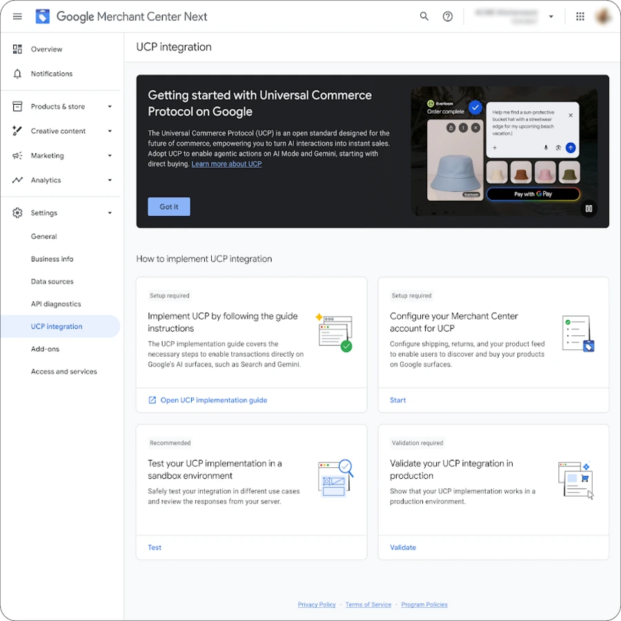 Google has published a self-service onboarding guide in Merchant Center that walks merchants through UCP profile configuration, identity linking, and checkout API implementation. A sandbox environment is available for testing before going live. Merchant Center will alert merchants about required updates to feed attributes, returns policies, and account settings.